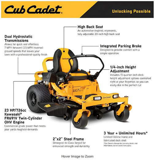 Cub CadetCub Cadet Ultima ZT1-60 26HP 60" Zero-Turn Mower Take mowing to the next level with the Cub Cadet Ultima ZT1-60—the flagship of the Ultima Series b...